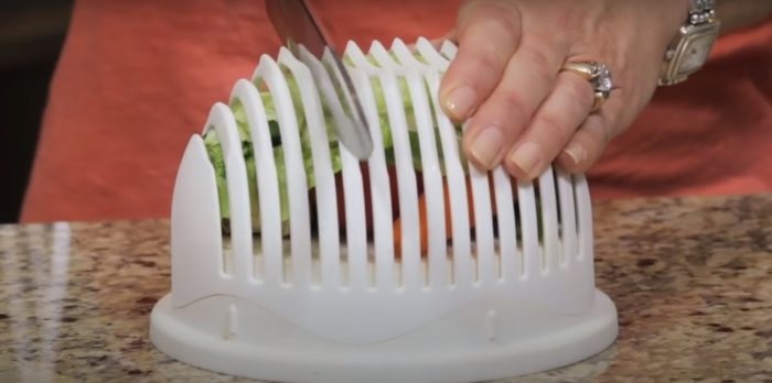 После закрытия гаджета его нужно перевернуть прорезями наверх, и через них нарезать салат на кусочки. Руками ничего не нужно фиксировать — быстрая и безопасная нарезка, после чего салат можно отправлять в красивую тарелку и смешивать с соусом.