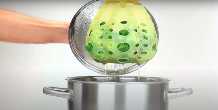 Силиконовый «мешочек» для варки продуктов поможет быстро довести до готовности все продукты и вовремя достать их из горячей воды. Туда можно поместить все необходимые ингредиенты для салата в порядке очередности по скорости приготовления, а потом сразу все достать. Сверху силиконовая формочка фиксируется с помощью крышки. Сверху также есть специальный держатель длинный держатель с крючком на конце, который можно повесить на край кастрюли, чтобы «мешочек» всегда находился в нужном положении. Держась за него, удобно вынимать силиконовую форму из горячей воды.