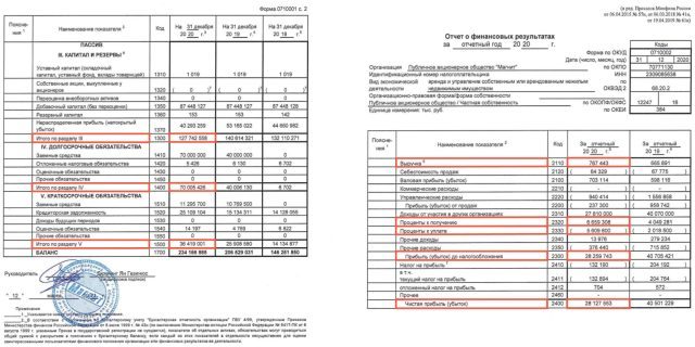 Российский стандарт бухгалтерского учёта соблюдают все публичные отечественные компании. Он не совсем подходит инвестору, потому что выкладки и особенности подсчёта данных нужны скорее бухгалтерам или налоговым аудиторам. Но иногда выбора нет.Предположим, что инвестор хочет присмотреться к ретейлеру «Магнит». Компания публикует несколько отчётов, нам нужна «Бухгалтерская отчётность» за последний полный год. Инвестор найдёт почти всё, что необходимо, на первых трёх страницах.