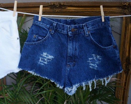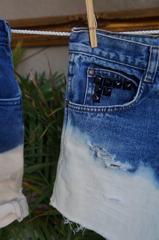 И еще один вариант изготовления новых шортов из старых джинсов. Джинсы не просто обрезали, но еще и обесцветили их часть в растворе хлорсодержащего средства: