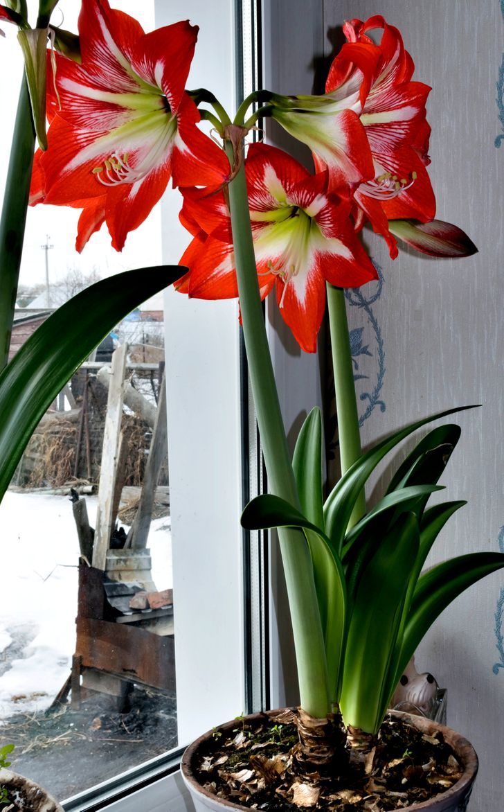 Яркий и броский гиппеаструм (амариллис) обычно продается уже с ростками и бутонами, но можно самостоятельно вырастить его из луковицы. Цветы сохраняют свой декоративный вид примерно 3 недели, потом засыхают и дают возможность раскрыться новым бутонам. Все, что требуется от хозяина, — поливать цветок.