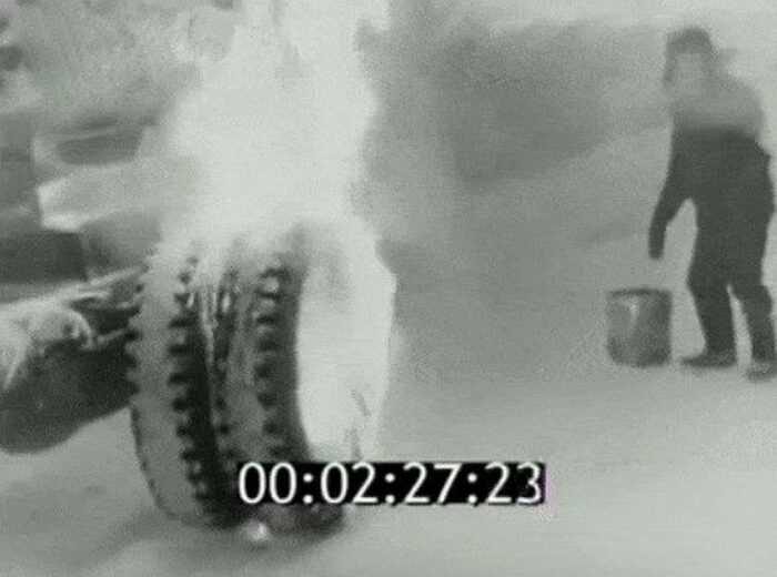 Именно подобные условия и заставляли советских водителей прибегать к довольно интересному лайфхаку, который однажды был заснят на пленку и до сих пор гуляет по Интернету и поражают неискушенных обывателей. А все потому, что на кадрах автомобилисты обливают покрышки горючим и поджигают их.