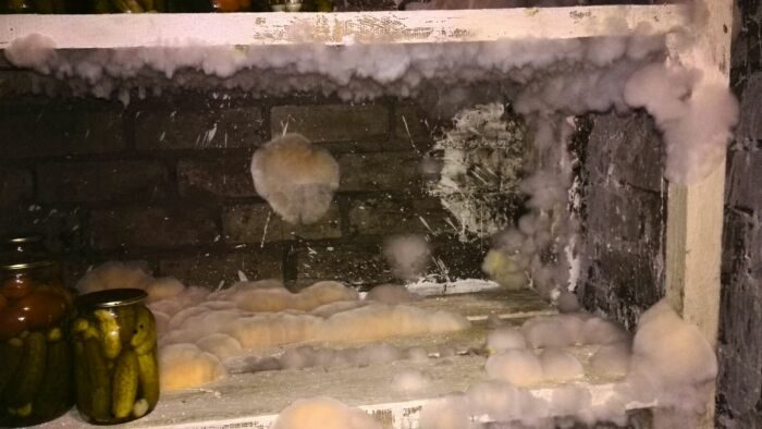 Когда погреб будет просушен, а плесень уничтожена физически, можно переходить к борьбе с хроническим образованием сырости. Для этого лучше всего использовать разнообразные абсорбирующие (впитывающие влагу) средства. Это могут быть обычная бумага или картон, прокаленная соль, хлорид кальция, сухие опилки. Абсорбент обязательно раскладывается в погребе в нескольких местах. Выбранное вещество будет впитывать влагу и предотвратит ржавчину крышек банок и размножение плесени. Само собой, впитывающие подстилки придется периодически менять.