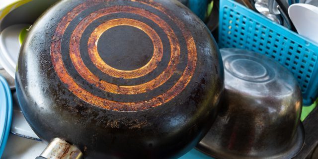 По возможности снимите с посуды все выступающие элементы, если они есть, например ручку со сковороды или котелка. Положите ёмкость в мусорный пакет. Затем всё вместе в следующий пакет и ещё в один. Это нужно сделать, чтобы наверняка не допустить протекания.