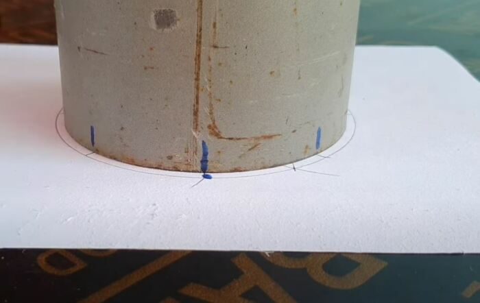 После этого прямо на трубе делается продолжение разметки, а именно – расчерчиваются клинья, которые в последствии будут вырезаться для сужения диаметра трубы. Метить нужно не на глаз. Необходимо посчитать значение по формуле (d1-d2)/8, где d – диаметр первой и второй трубы. Получившееся число делим пополам. Далее его используем для разметки для создания отступа от каждой из уже проведенных 8 полос вдоль окружности трубы.