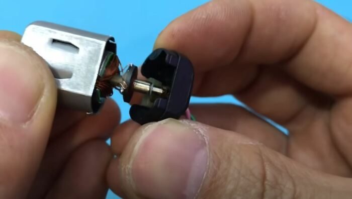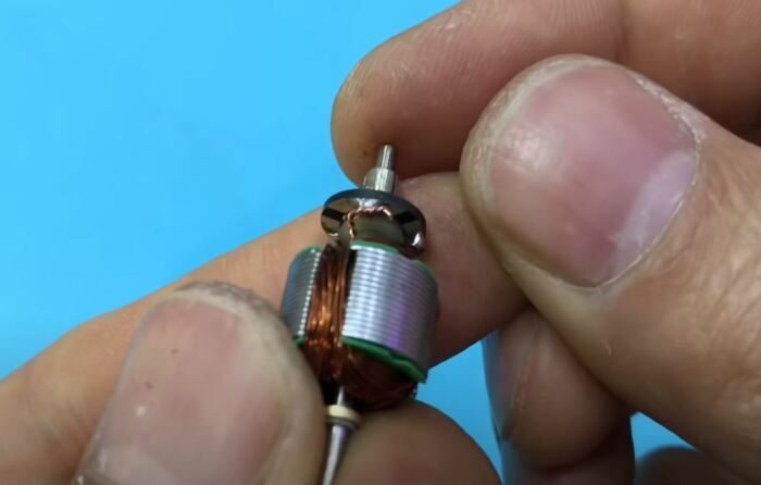 Для того, чтобы повысить мощность моторчика от игрушки, сначала его придется извлечь из ее конструкции. Как только это будет сделано, потребуется осуществить разборку силового агрегата. Мотор разбирается на составные части, после чего извлекается его якорь. Любым доступным способом с него убирается «родная» обмотка. Можно смело ее срезать, она нам больше не понадобится.