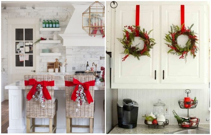 Для начала определитесь с цветовой гаммой. Классической является бело-синяя и красно-желтая, но вы можете подобрать и другой вариант, который вас устроит. Если есть время, сделайте венок своими руками и повесьте на дверь, ведущую в кухню, либо над окном. Подключите фантазию, ведь этот декоративный элемент может быть каким угодно: из еловых веток, из ткани, из бумаги, из фетра. В качестве декора могут служить елочные игрушки, палочки корицы, шишки, банты из ткани и многое другое. Простые элементы, но они помогут превратить кухню в идеальное помещение для праздничных застолий.