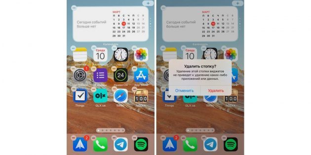 Для удаления достаточно задержать палец на виджете и перетащить его на появившийся крестик или нажать на значок минуса.