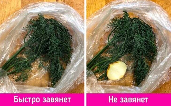 7. Положите в пакет с зеленью половину луковицы, и зелень, особенно укроп, не завянет