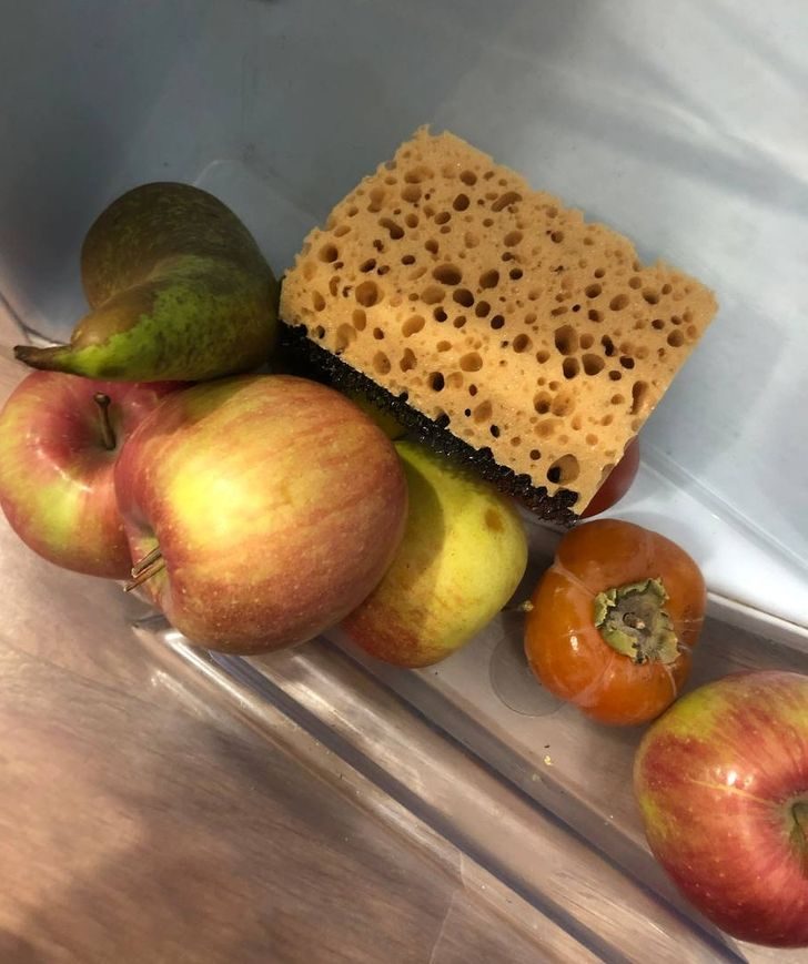 3. «В контейнер с овощами и фруктами в холодильнике кладу сухую поролоновую губку. Так они дольше хранятся»