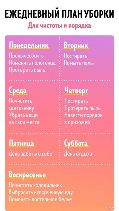 Ведение хозяйства – это рутина, в которой можно потеряться. Чтобы такого не произошло и вам не приходилось тратить целые выходные на приведение квартиры в порядок, составьте специальный график. Например, в понедельник вы стираете и гладите, во вторник моете окна, в среду убираете пыль и пылесосите, в четверг чистите сантехнику, в пятницу наводите порядок на кухне. Либо можно сделать разделение по комнатам: сначала убирать в ванной, на следующий день – в спальне и так далее. Если у вас есть система, квартира не будет захламляться и получится без труда поддерживать ее в идеальном состоянии.