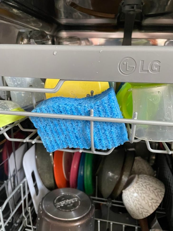 Чтобы губка для мытья посуды оставалась чистой и безопасной, кладите ее в посудомойку вместе с грязными тарелками.