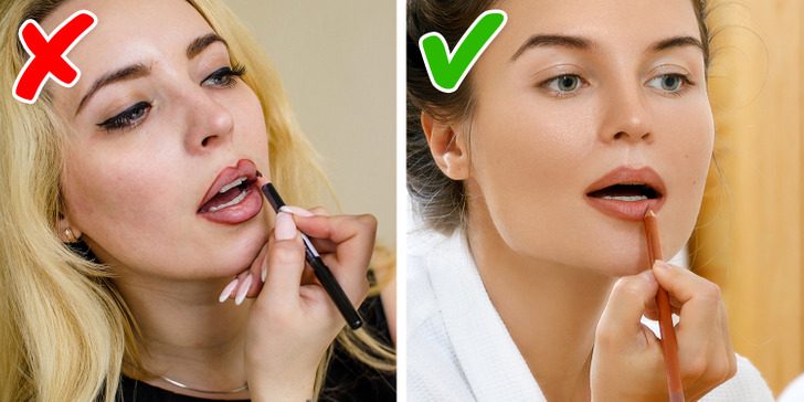 Крася губы, мы, как правило, стараемся сделать их более полными и привлекательными. Чтобы добиться этого эффекта и макияж при этом получился натуральным, нужно не только обрисовывать контур губ, но и растушевывать карандаш, заходя на сами губы, и лишь затем наносить сверху блеск или помаду. Так вы избежите графичного эффекта и губы будут выглядеть красиво, даже если помада случайно сотрется.