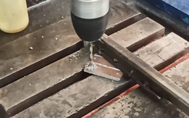Далее, из пластинки металла нужно отрезать пару полосок и просверлить в них по два отверстия.
