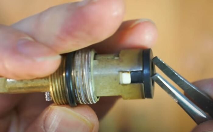На задней части буксы необходимо увидеть силиконовый уплотнитель (чаще всего он черного цвета, но бывает и цветной). Его следует аккуратно снять, а следом за ним также аккуратно извлечь две керамические пластинки. После этого необходимо осуществить выталкивание поворотного штока. В зависимости от конфигурации конкретной буксы делается это или через снятие кольца, или через выкручивание стопора. После их устранения шток выйдет сам собой.