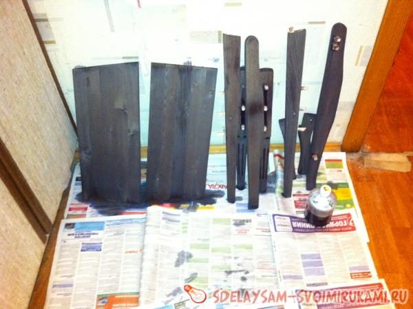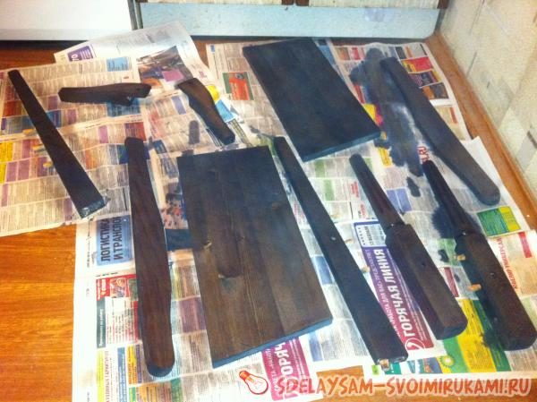 3. Затем из строительного щита вырезаем детали нужной нам формы и все остальные детали покрываем морилкой.
