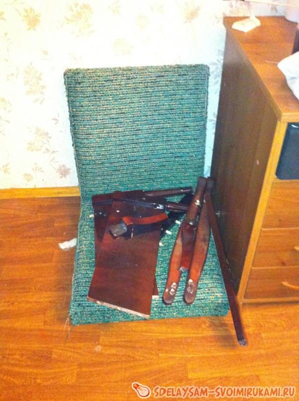 5. Приступаем к обшивке самого сидения кресла. Снимаем старое покрытие и вытаскиваем все гвозди и скобы. Мы оставили старый поролон, потому что он не сильно испортился.