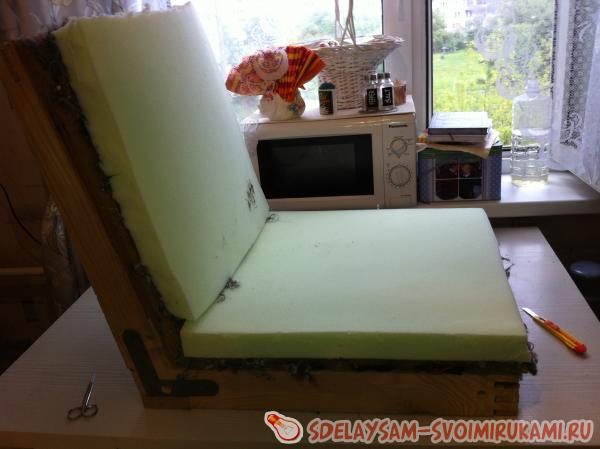 Наша цель — сделать кресло более объемным, поэтому мы вырезали новый поролон и положили его на старый.