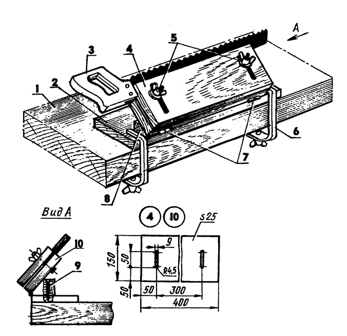 Устройство для заточки пилы: 1 — крышка стола; 2 — основание; 3 — инструмент (ножовка); 4 — зажимная планка (2 шт.); 5 — болты М8 с шайбами и барашковыми гайками; 6 — струбцина (2 шт.); 7 — карточная петля (2 шт.); 8 — опора; 9 — шуруп (2 шт.); 10 — опорная планка; детали 2,4 изготовлены из буковой доски сечением 150x25 мм; на виде А струбцины не показаны.