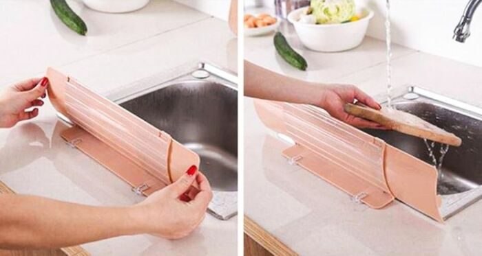 Вода такая вода! Она всегда рикошетит на пол во время мытья посуды и других процедур в мойке/раковине. Но если купить копеечную пластиковую ширму для мойки, то это навсегда перестанет быть проблемой.
