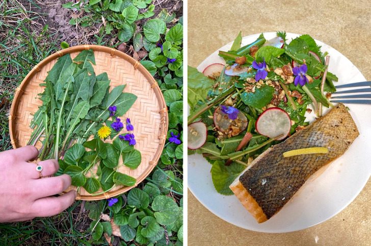«Много зелени из одуванчиков и фиалки с моего двора — и у меня получается вот такой салат!»