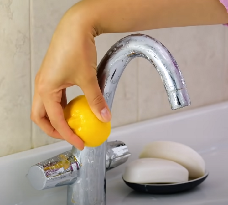 Известковый налет с металлических элементов в ванной будет убрать проще, если предварительно протереть их лимоном: кислота эффективно разъест загрязнения, после чего останется лишь протереть поверхность.