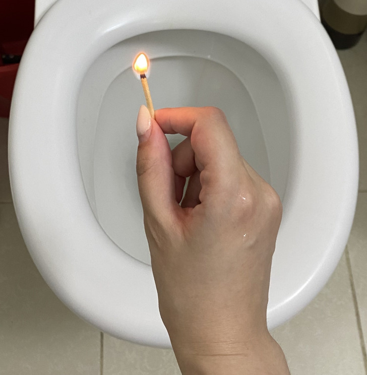 Если в туалете не оказалось освежителя воздуха, но вам необходимо максимально быстро замаскировать неприятный запах, чтобы не чувствовать себя неловко, — просто зажгите спичку и дайте ей немного прогореть.