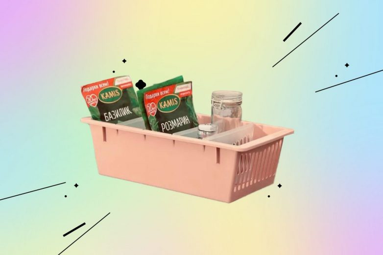 Прямоугольный пластиковый контейнер поможет навести порядок внутри шкафчика. В нём удобно хранить, например, специи в бумажных пакетиках. Контейнер разделён перегородками на несколько секций, так что можно разложить специи по категориям: для мяса, рыбы, сладостей и так далее.