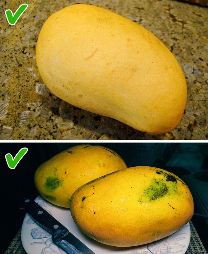 Темные пятна на кожуре манго не обязательно говорят о том, что фрукт испорчен и начал гнить. Почти перед самым сбором урожая дерево начинает выделять едкий сок, который капает на плоды и оставляет ожоги. Такие следы говорят о том, что фрукты были более спелыми, когда их сорвали.