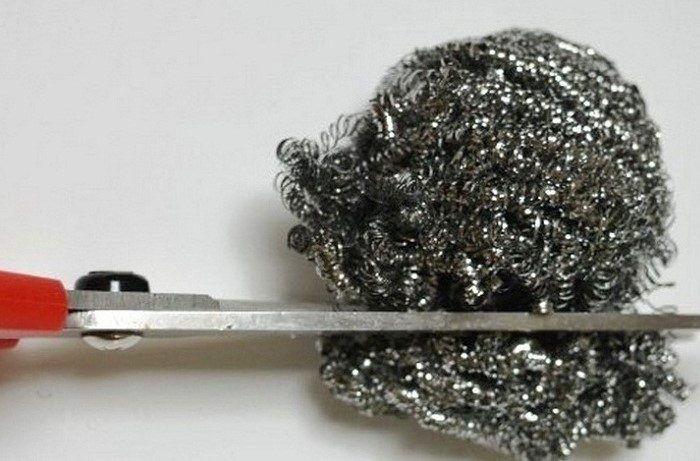 Металлической губкой можно не только отмывать посуду, но и точить ножницы. Используйте ее так же, как фольгу и наждачную бумагу. Просто нарежьте мочалку (или две) на мелкие кусочки. Предварительно подготовьте мусорное ведро или мешок, чтобы сразу выбросить остатки.
