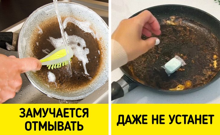 Кажется, нет ничего хуже, чем до посинения оттирать пригоревший жир со сковороды. Но если бросить в сковородку таблетку для посудомоечной машины, залить ее кипятком и оставить на 30 минут, то можно сэкономить силы и нервы. По истечении этого времени вылейте грязную жидкость в раковину и протрите сковородку губкой под проточной водой. Остатки грязи сойдут на раз-два, и не останется ни намека на толстый слой жира.