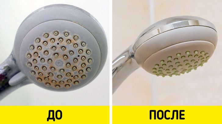 О лейке для душа часто забывают во время генеральной уборки. Чтобы вернуть ей былой блеск, разведите 1 ст. уксуса в 1/2 ст. воды и опустите в жидкость насадку для душа. Оставьте на пару часов и затем тщательно промойте.
