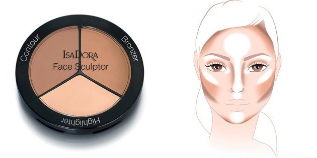 Палетка для контурирования с бронзером, скульптором (contour) и хайлайтером, а также схема нанесения. Белым отмечены зоны для хайлайтера, рыжим — бронзера, коричневым — скульптора