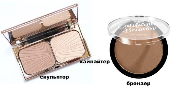 Скульптор — это серо‑коричневый продукт, с помощью которого имитируются тени на лице. Например, чтобы подчеркнуть скулы, им затемняют область под скуловой костью. Бронзер имитирует загар. Поэтому он более рыжий, нередко содержит сияющие частицы, которые создают объём, а не тень.