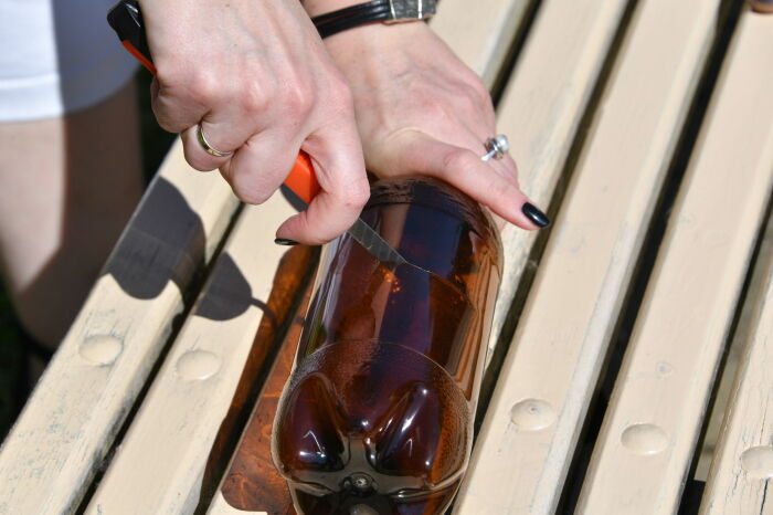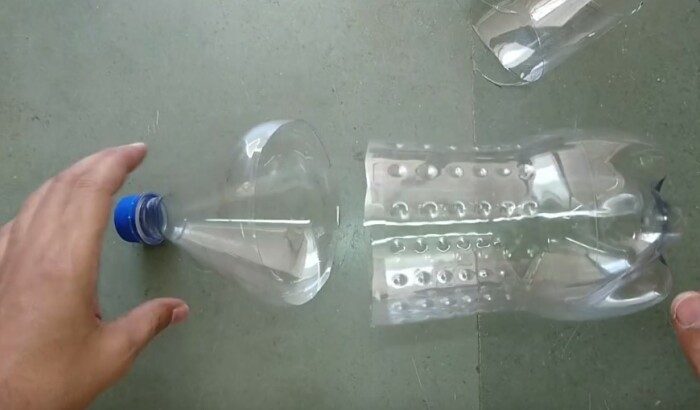 Для работы нам понадобится обычная 1.5-литровая пластиковая бутылка. Взять можно, например, от минеральной воды или напитка. Первым делом емкость необходимо тщательным образом помыть. Далее как следует накручиваем на ее горлышко пробку, после чего разрезаем емкость примерно по середине, чтобы получилось две относительно одинаковые половинки.