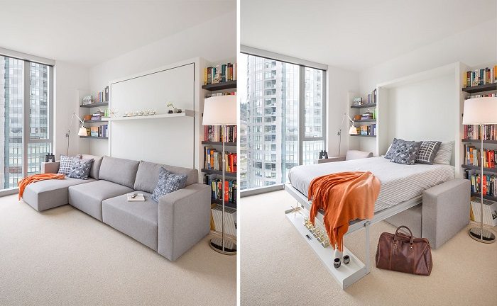 Еще одно прекрасное решение для малогабариток, когда диван превращается в полноценную двуспальную кровать, и наоборот. Данная конструкция выглядит так: в открытом виде постель (с высоким спальным местом) опускается поверх дивана, а в закрытом – поднимается за его спинку и превращается в мебельный фасад с полками. Единственный минус подобного трансформера состоит в том, что диван выбрать не получится – придется покупать тот комплект, который предлагает производитель мебели.