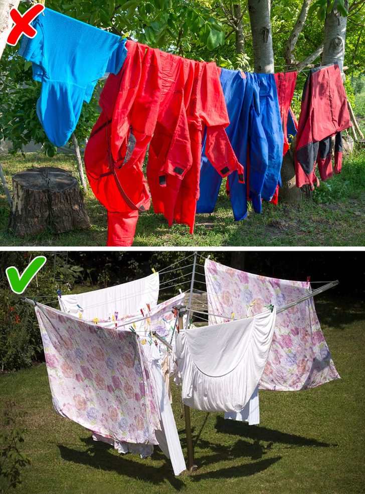 Есть секрет, касающийся сушки постельного белья или больших полотенец. Если вы используете обычную бельевую веревку, то повесьте на нее плечики для одежды и поверните так, чтобы они находились перпендикулярно веревке. А поверх этой конструкции вешайте простыни и другое белье. Этот способ поможет лучше циркулировать воздуху, и вещи быстрее высохнут.