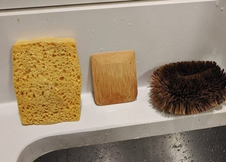 Большинство губок для мытья посуды содержат частицы пластика, из-за чего они не разлагаются, а загрязняют планету. Лучше выбирать натуральные разлагаемые губки из кокосового волокна. Безопасными также считают целлюлозные губки, но в некоторые из них добавляют пластик, поэтому перед покупкой следует проверять состав.