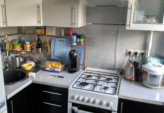 Хочется, чтобы во время работы все было под рукой. Однако мелкие предметы, баночки со специями, кухонные приспособления и другие устройства только захламляют пространство. В результате на столешнице царит хаос, места не хватает, где готовить тоже неясно. Оставьте на поверхности только технику, которую нельзя спрятать в шкафу. Например, электрочайник, кофеварку, тостер, а для прочих мелочей организуйте место для хранения в закрытых шкафчиках.