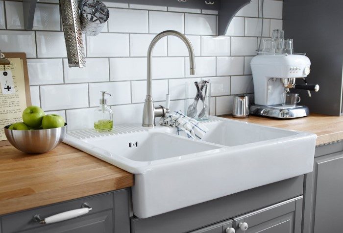 В ограниченном пространстве каждый сантиметр на счету, но маленькая мойка — плохой вариант. Даже если поместить в раковину несколько тарелок, она уже будет казаться забитой. Также готовьтесь к тому, что стена и столешница постоянно будут забрызганы водой.