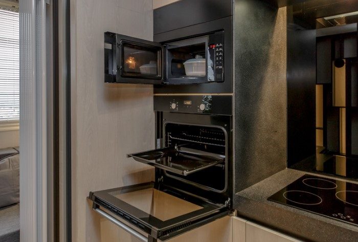 Долгое время большой популярностью пользовались микроволновые печи, встроенные в верхний ряд кухонного гарнитура. Казалось, что такой прием сэкономит много места. На деле же доставать разогретые блюда сверху оказалось не самой удобной и безопасной идеей. В верхних шкафчиках лучше расположить посуду или предметы, которыми часто пользуетесь. А микроволновку поставьте на уровне груди и уж точно не отводите ей главную роль на кухне.