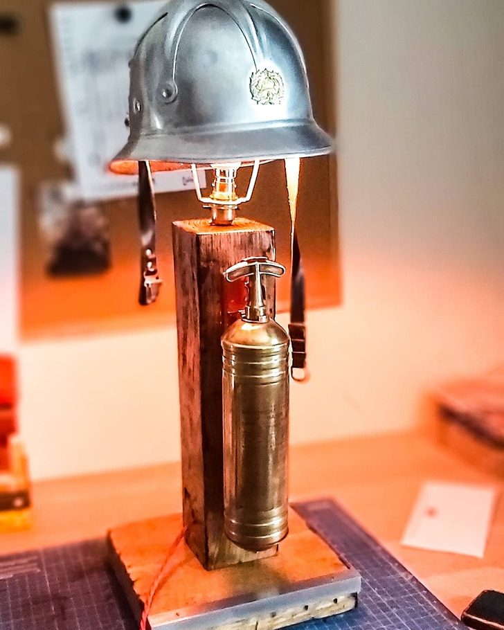 «Из старинного пожарного шлема и огнетушителя соорудил настольную лампу»