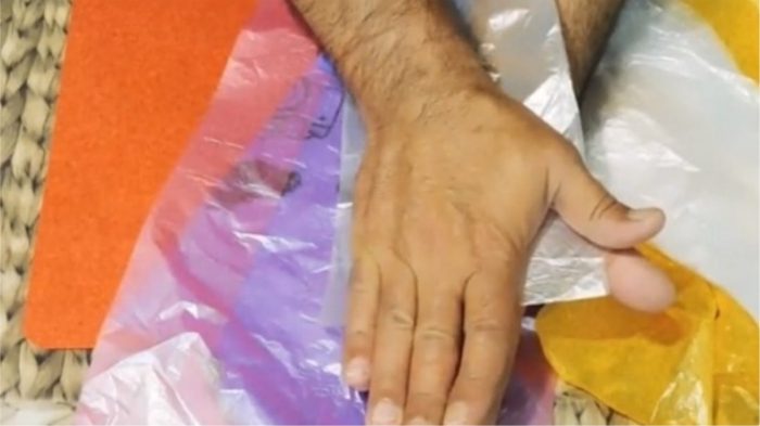 Пакет кладем на ладонь стороной, где ручки. Сверху кладем вторую ладонь и трем их между собой. В итоге, две стороны пакетика быстро раскрываются.
