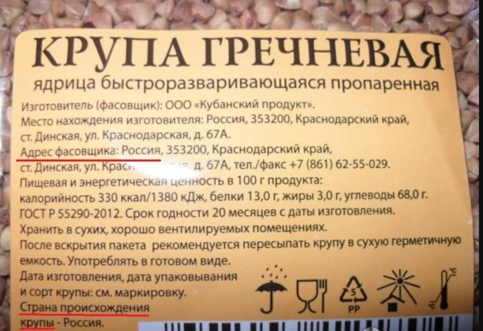 В ряде случае страна, вырастившая гречку, указывается латинской буквой после даты производства: R – Россия, С – Китай и т.п. В этом случае на пачке крупы должна содержаться пояснительная записка по поводу обозначений.