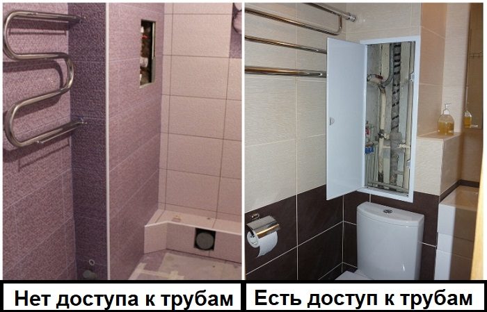 Никто не хочет выставлять водопроводные и канализационные трубы на всеобщее обозрение, однако нельзя их полностью замуровывать в стены. Доступ к важным узлам понадобится в любое время, кроме того, замаскированная труба может подтекать в местах соединения, а вы этого даже не заметите. Когда проблема обнаружится, придется не только разрушать отделку санузла, но также финансировать ремонт соседей снизу, так как вы их затопите.