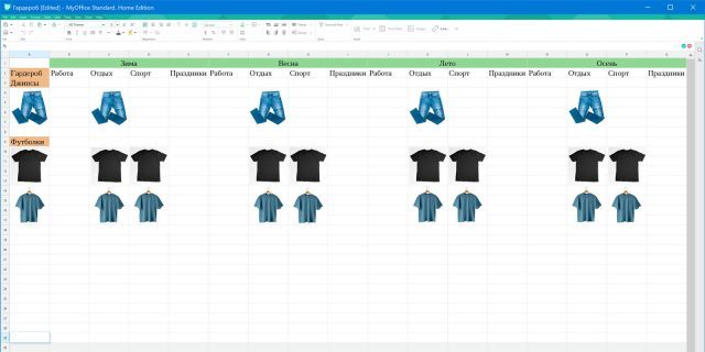Справиться с проблемой «шкаф не закрывается, а носить нечего» поможет систематизация. Создайте в редакторе таблицу из пяти столбцов. Первый — для категорий вещей (блузки, джинсы, платья); остальные четыре — для времён года. Разделите сезонные столбцы на дополнительные по сферам жизни (например, работа, отдых, спорт, торжественные мероприятия). Добавьте в первый столбец все вещи, которые есть в вашем гардеробе, и распределите их по сезонам и сферам жизни. Например, джинсы можно носить круглый год на работе и отдыхе. Для наглядности лучше использовать не описания вещей, а их фотографии. Предпочтительно фотографировать свою одежду, но можно найти и похожие картинки.