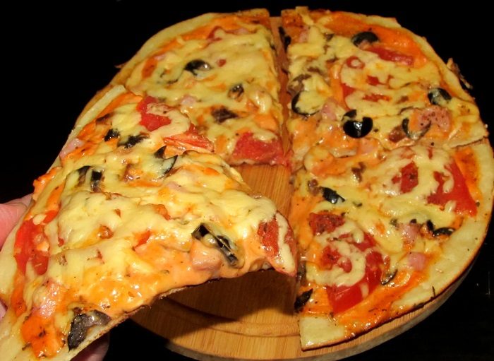 Многим хозяйкам кажется, что чем больше начинки в пицце, тем она получается красивее, аппетитнее и вкуснее. Однако в этом вопросе очень важно соблюдать баланс и строгие пропорции. Поэтому старайтесь придерживаться рецептуры и класть ровно столько продуктов, сколько указано. Таким образом, вы получите хрустящее тесто, которое не будет прогибаться и ломаться под весом начинки, и сможете есть его руками, как принято в Италии.