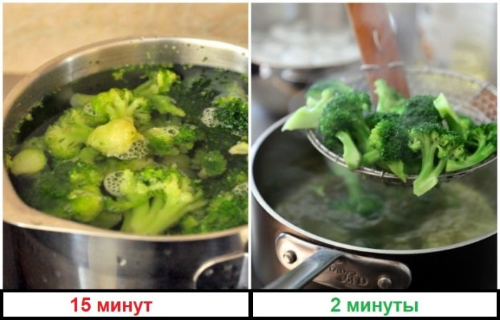 Дальше если вы терпеть не можете недоваренные овощи, стоит помнить, что некоторые из них нельзя долго подвергать термической обработке. Так, например, брокколи и шпинат не переносят длительное варки, поэтому их просто обдают кипятком или проваривают пару минут в кипятке. В зависимости от овоща, время приготовления варьируется от двух до пяти минут. Подобный способ приготовления не только сохранит цвет овощей, но также сократит до минимума потерю витаминов и подарит великолепный вкус.