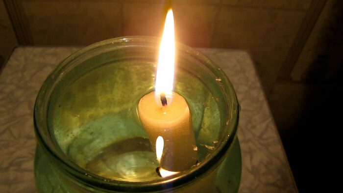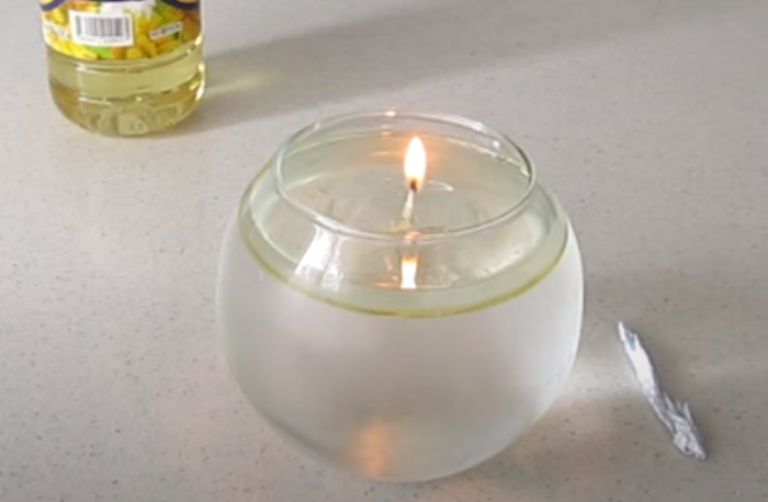 Прежде всего нужна самая простая свеча. Не имеет значения, какая она будет (тонкая или толстая). Также понадобится небольшая емкость: баночка, стаканчик. В емкость на дно капается немного парафина и ставится туда свеча. Затем до уровня фитиля наливается растительное масло. Самое простое подсолнечное подходит как нельзя лучше.