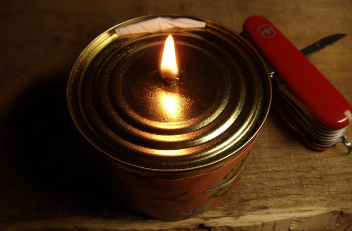 Этот способ похож на предыдущий, только вместо картофелины берем жестяную банку от консервов, в крышке проделываем отверстие шилом, вставляем в него фитиль. Его можно сделать из разных материалов: бинта, ваты, тряпочки, ниток, шнурка и т.д. В емкость наливается масло и свеча готова.